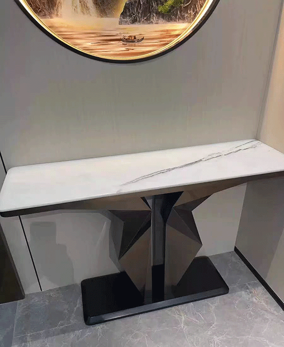 This console table is a great choice of luxe update for your lounge or home entrance. The golden base takes its inspiration from modern design, and the sintered stone and marble top is a stain-resistant finishing touch. Your choice of accessories on top of the console table can add personality that defines your home.