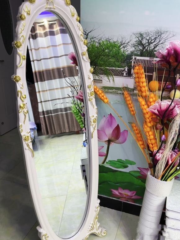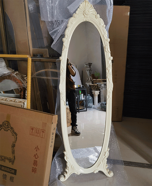 Elevate your home decor with our Baroque Style Framed Full Length Oval Silver Floor Mirror. This ornate mirror in mid-century art decor style features a silver mirror with PU backing and PU frame, and is available in white/pink/silver/white with silver/white with gold color details. Get compliments from your guests with this high-quality and well-designed mirror.