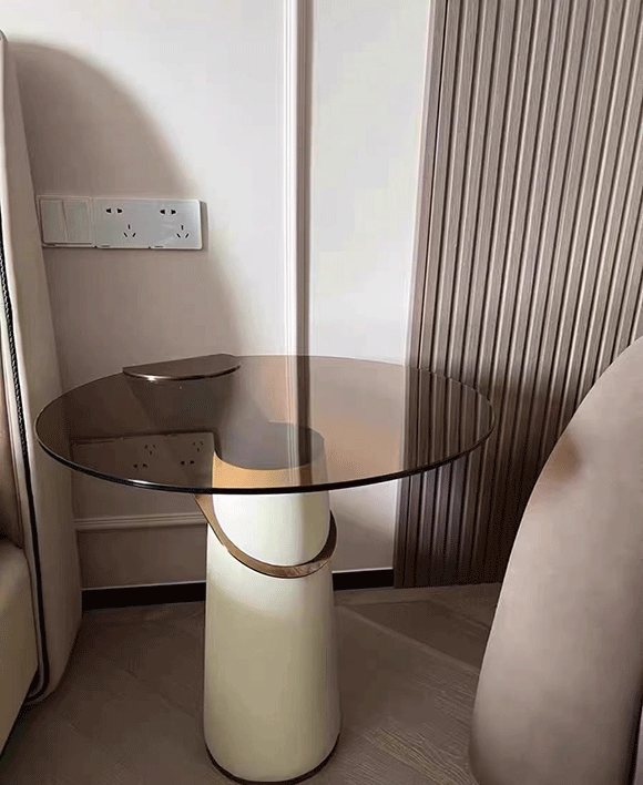 Beige & Brown & Gold Round Metal & Glass Side Table