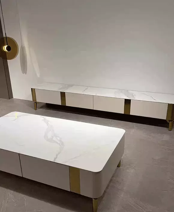 Upgrade your living room with this sophisticated beige sintered stone coffee table, complete with striking metal legs in your choice of gold or grey. The luxurious sintered stone top, paired with an eco-friendly E1 grade lacquer board, offers both elegance and durability. Measuring 130x70x41cm, it features four spacious drawers to store your essentials, keeping your space clutter-free. Perfect for modern interiors, this coffee table is the ultimate blend of style and practicality, making it a standout piece for any living area.