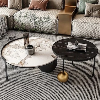 ☞ Shop here https://www.misscitystyle.com.au/modern-white-black-sintered-stone-and-metal-frame-round-coffee-table-set-of-2.html