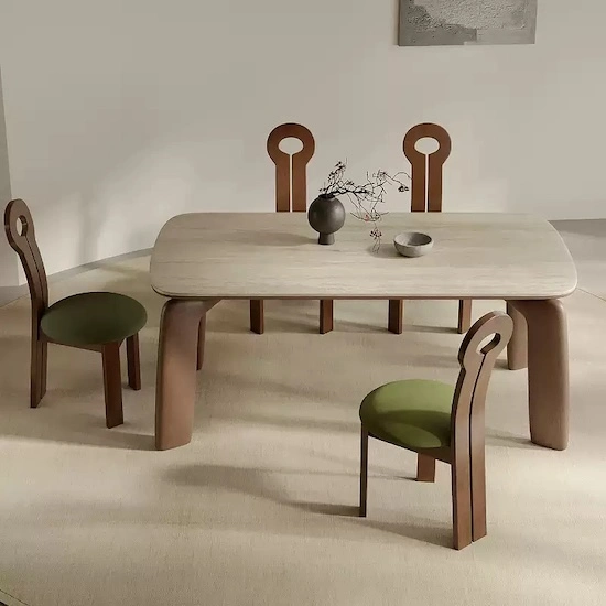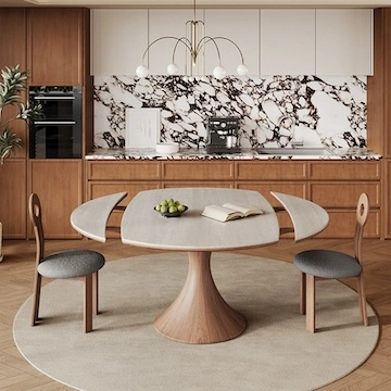 All our tables feature sintered stone surfaces — scratch-resistant, stain-proof, heat-tolerant, and easy to clean. - Elegant Solid Wood Bases: