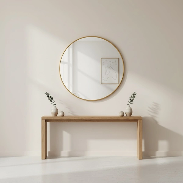 An oversized round mirror creates the strongest shift in a room. It draws the eye immediately and can make a plain wall feel styled with minimal effort.