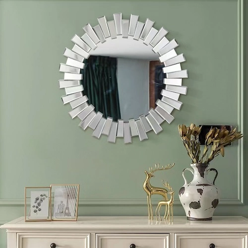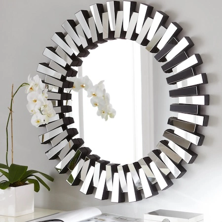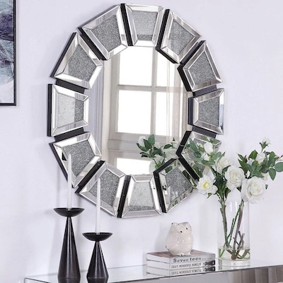 - Round Faceted Silver Wall Mirror — perfect for adding modern elegance to bedrooms, entryways or dining rooms.