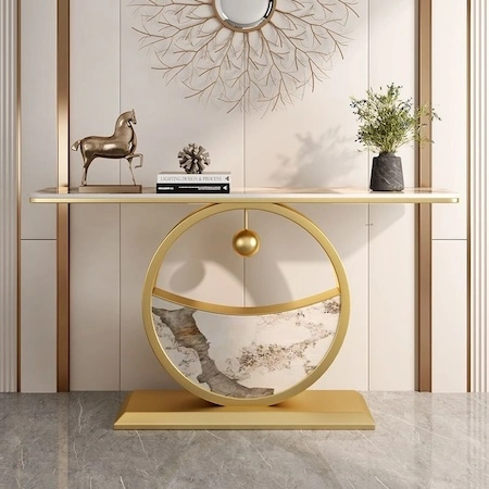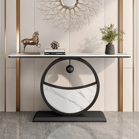Make a statement in your entryway or hallway with this elegant console table. The half-circle metal base paired with a sintered stone or artificial marble top exudes modern Chinese sophistication. With six base color choices and fully customizable sizes, this console table is designed to fit seamlessly into any home decor. Now 20% off!