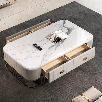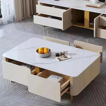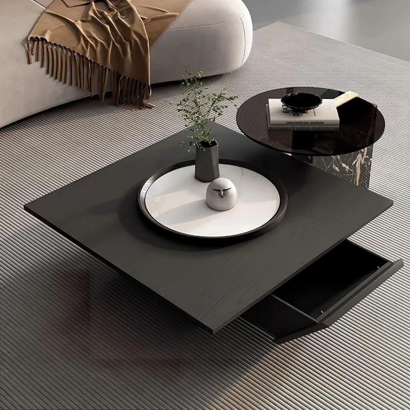 This one’s all about subtle drama. A tempered glass upper layer adds airiness, while the underlying sintered stone platform grounds the look. It’s modern, sculptural, and unexpectedly dynamic. The layered design also gives you two levels of surface space—perfect for hiding remotes, stacking books, or keeping your coffee clear of clutter.