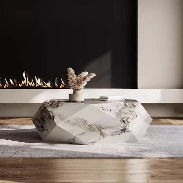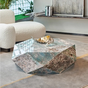 If you like your furniture to be a little bit jewelry, this is it. Featuring a faceted, diamond-cut rose gold base and a gleaming stone top, this piece is unapologetically glamorous. It reflects light, catches the eye, and adds immediate sophistication to any space.