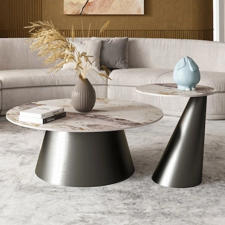 ✨ 6. Modern Italian Style Metal Conical Base Round & Oval Coffee Table Set of 2