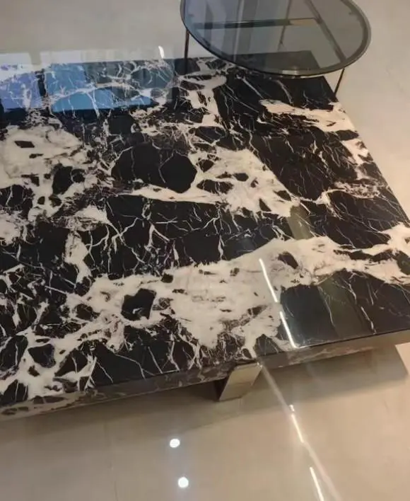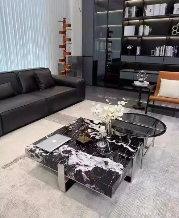 The Bvlgari Black Marble Coffee Table Set Of 2 With Stainless Steel Base is a luxury statement piece designed for modern, glam, and high-end interiors. Crafted from authentic Bvlgari Black Marble, tempered glass, and a mirror-polished stainless steel base, this premium stone coffee table set delivers a striking sculptural presence in any living room.