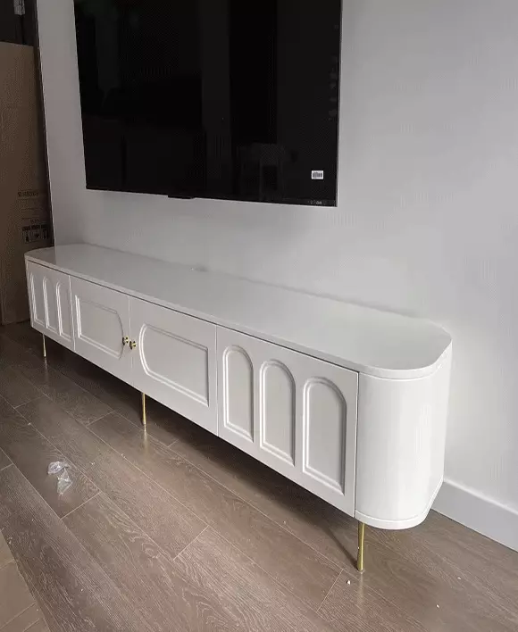 Add a stylish touch to your living room with this creamy white TV unit, featuring a unique pumpkin-inspired design. Equipped with both drawers and cabinets, this TV unit with storage offers ample space to keep your entertainment essentials organized. Crafted from E1 grade environmentally friendly lacquer board and supported by stainless steel electroplated legs, it combines durability with a chic aesthetic. Customizable in size, this TV unit and storage solution blends seamlessly into any modern home. Dimensions: 200x40x42cm, with customizable sintered stone top options available.