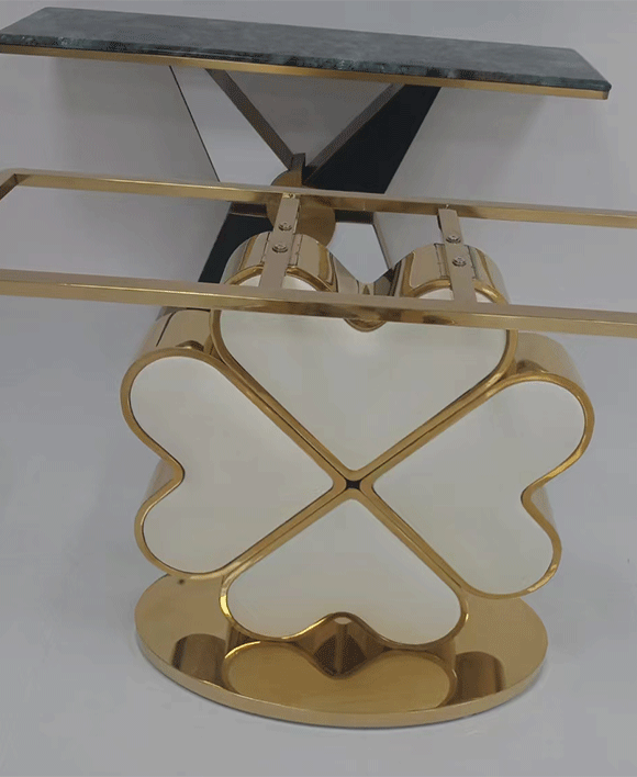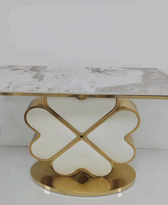 This console table is a great choice of luxe update for your lounge or home entrance. The golden base takes its inspiration from modern design, and the sintered stone and marble top is a stain-resistant finishing touch. Your choice of accessories on top of the console table can add personality that defines your home.