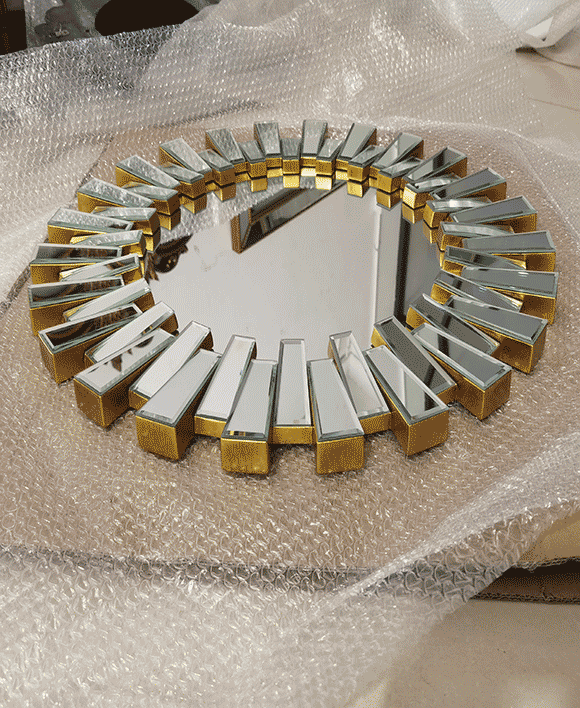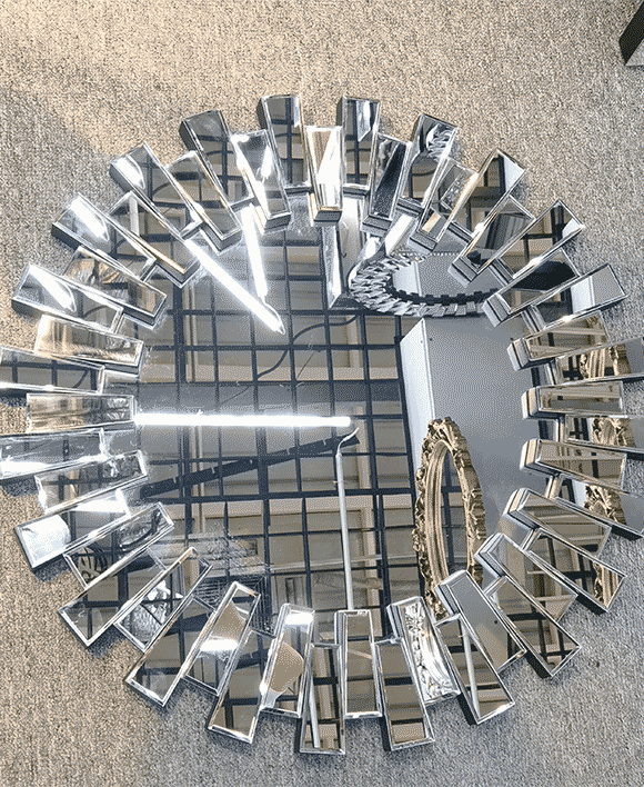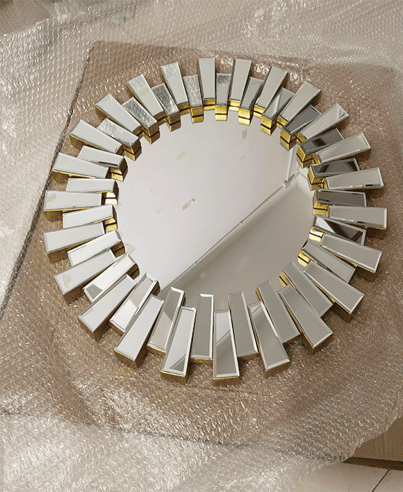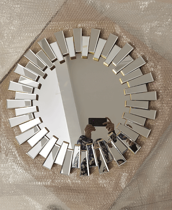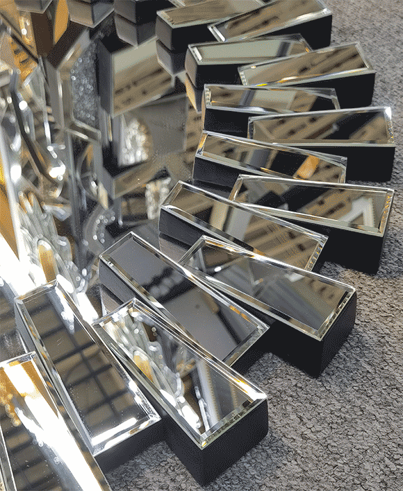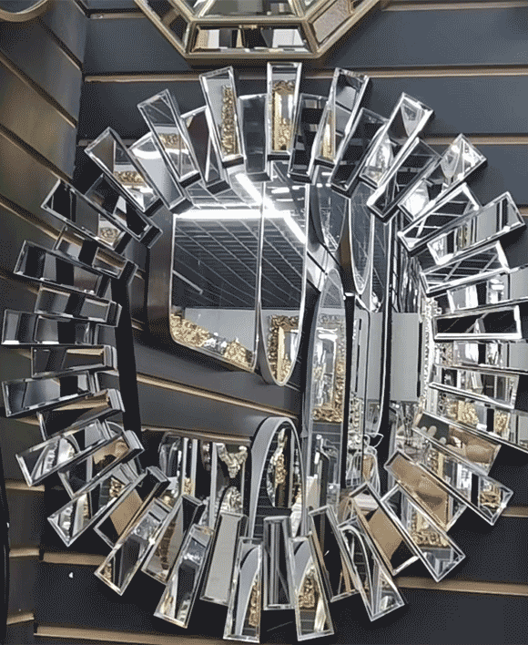 TheSunburst shaped multi faceted mirror is a centerpiece that brings modern design and affordability together. Crafted with a silver mirror and PU backing, it offers a stunning blend of contemporary and art décor styles.