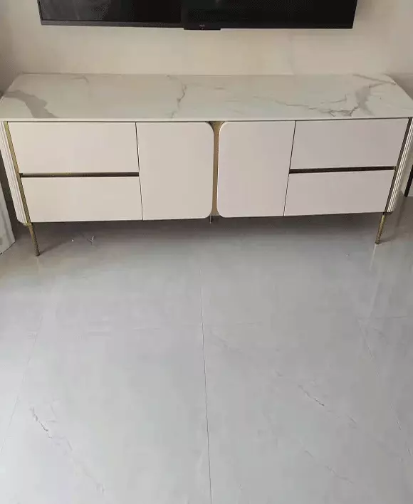 This stunning beige rectangular coffee table features a sintered stone top and sleek metal legs with a stainless steel electroplating finish. Made from E1 grade environmentally friendly lacquer board, this coffee table combines modern design with durability. The size and sintered stone top are customizable to fit your space perfectly. Ideal for any contemporary living room. Dimensions: 130x70x42cm.