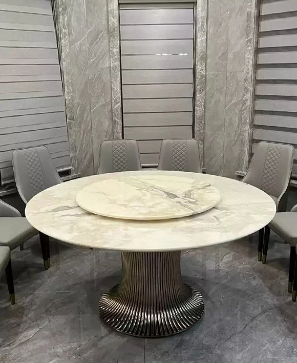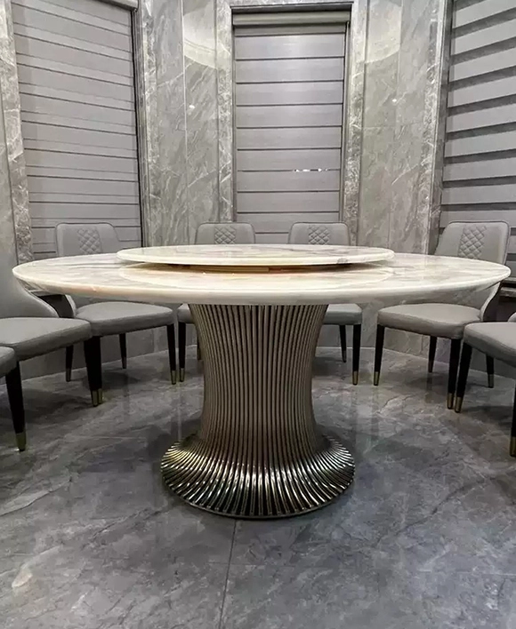 Bring a touch of glamour to your dining space with the Glam Metal Abstract Curved Base and Sintered Stone Top Round Dining Table with Lazy Susan. This eye-catching round dining table combines sculptural elegance with modern function, perfect for both daily meals and stylish entertaining. The high-performance sintered stone dining table top is not only luxurious but also durable and low-maintenance. Ideal for breakfast room tables or chic dining room round table layouts, this piece seats 4 to 8 comfortably and includes a Lazy Susan for added convenience. Whether you’re searching for a standout dining table set, a round table for dining, or a statement piece for your dining table and chairs layout, this design delivers. Customisable in colour and size, it elevates any setting from dining tables sets to full dining room setting table ensembles.