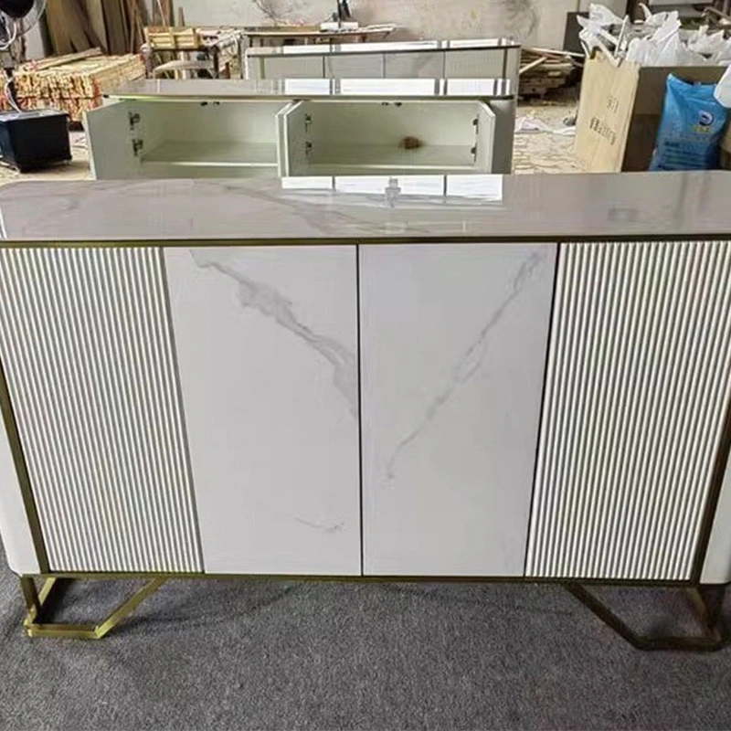 Introduce luxury to your home with this glam sintered stone strip sideboard buffet, featuring a gold accent for an elegant finish. This modern sideboard is perfect for dining room storage, offering both style and practicality. Crafted with a stainless steel frame and E1 grade environmentally friendly lacquer board, this buffet cabinet is built to last. Its sintered stone countertop is customizable in a variety of colors to suit your decor. The spacious interior and adjustable shelves make it an excellent buffet storage solution for dining room sideboard cabinets or buffet furniture. Measuring 150x40x90cm, it’s an ideal addition to your dining room buffet table, tall sideboard, or white sideboard. The sturdy sideboard with metal legs provides reliable support, and its design makes it a perfect buffet with shelves or buffet with stone top for any modern home.
