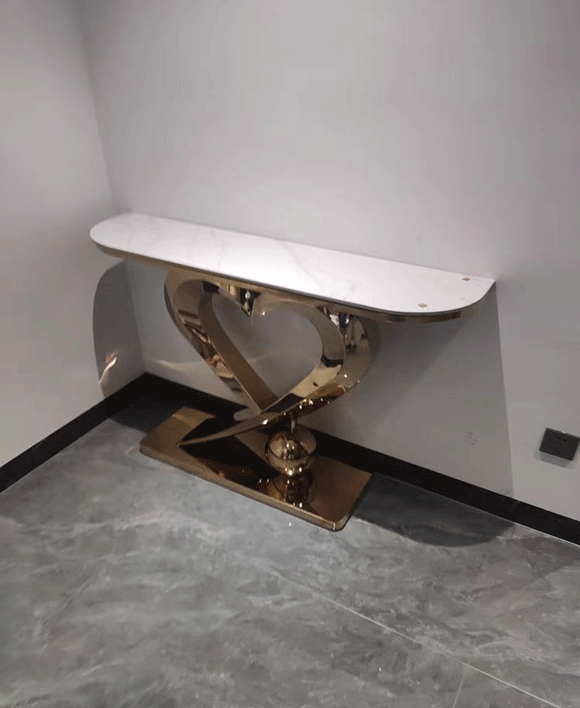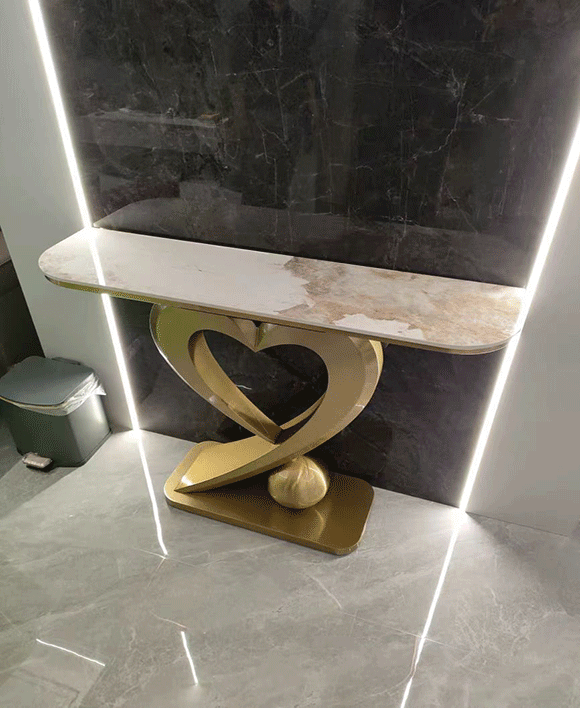 This console table is a great choice of luxe update for your lounge or home entrance. The golden base takes its inspiration from modern design, and the sintered stone and marble top is a stain-resistant finishing touch. Your choice of accessories on top of the console table can add personality that defines your home.