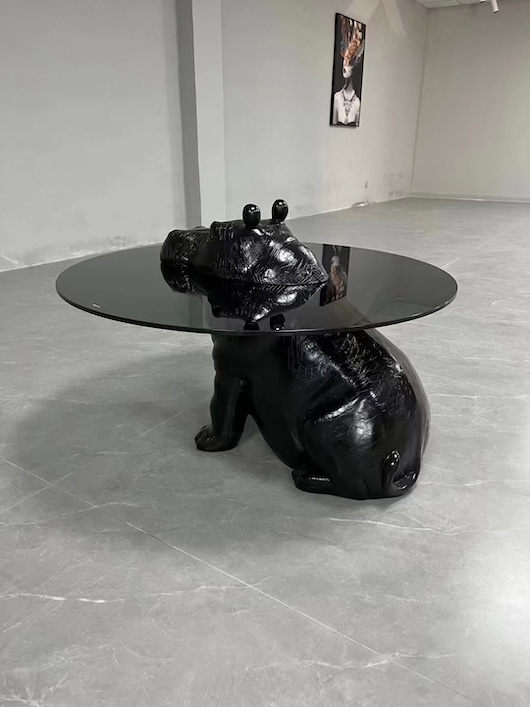 Innovative Hippo Base Designer Coffee Table with Fiberglass Top Introducing our unique Designer Coffee Table, featuring an eye-catching hippo base and a sleek fiberglass top. This table is a fusion of creativity and modern design, ideal for those who seek a distinctive touch in their living spaces. Striking Hippo Base for a Conversational Piece The centrepiece of this designer coffee table is its remarkably crafted hippo base. This feature not only adds an element of whimsy to the design but also makes the table a conversation starter. The hippo base is perfect for those who appreciate nature-inspired elements in their furniture. Durable Fiberglass Top for Contemporary Elegance Complementing the hippo base is a top made of high-quality fibreglass. This material is known for its durability and smooth finish, offering a modern and stylish surface that is easy to maintain and clean. Grey Glass Finish for a Sophisticated Look The fibreglass top is finished with a grey glass effect, adding an extra layer of sophistication to the table's design. This grey glass designer table easily integrates into various colour schemes and interior styles, from the avant-garde to the minimalistic. Designer Coffee Table for Modern Interiors As a designer coffee table, this piece embodies innovative table design, seamlessly blending art and functionality. Its unique appearance makes it more than just a furniture item; it's a statement piece that elevates the aesthetic of any room. Versatile and Practical Despite its artistic base, this coffee table is designed with practicality in mind. It offers a spacious top for your everyday needs, whether it's for holding beverages, displaying books, or showcasing decorative items. Embrace the blend of art and practicality with our Hippo Base & Fiberglass Top Coffee Table, a designer piece that brings a touch of the extraordinary to your home.