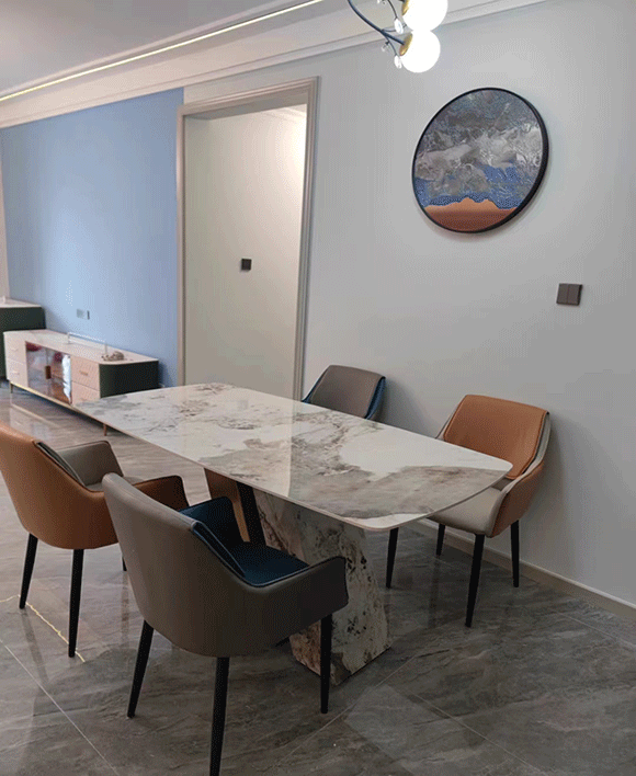 The Inclined Metal and Stone Column Base Dining Table is a striking fusion of sculptural artistry and everyday practicality. Its sleek rectangular sintered stone dining table top is heat resistant, scratch resistant, and effortless to maintain—ideal for breakfast room tables, modern family dining areas, boutique cafés, restaurants, and stylish office environments.