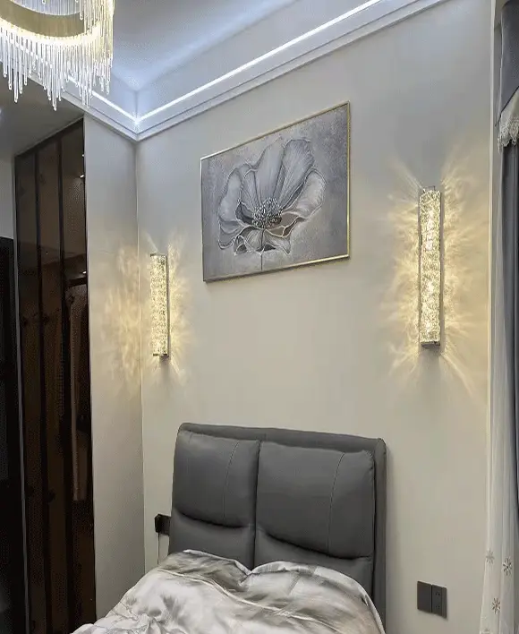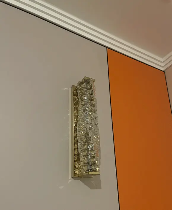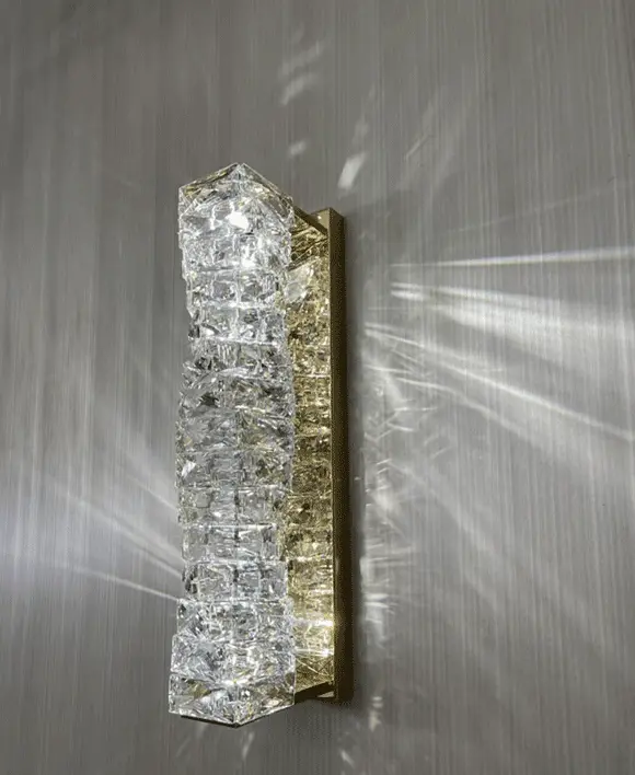 Our Laminated Crystal Wall Light is a beautiful and modern addition to any room. Constructed with stainless steel and shining crystal, this wall light provides a graceful lighting accent that will elevate your home decor. Its contemporary, chic design will leave guests in awe! This laminated crystal wall sconces are an elegant layered form that refracts and reflects light beautifully. Like harmonic notes sliding up and down, exemplifying the structure of the musical term that this piece is named after. This charming piece is sandwiched between two sleek stainless steel arms, creating ribbons of color that interact with the rectangular panels that anchor it to the wall.