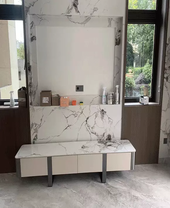 Transform your living space with this luxurious sintered stone and metal TV unit. Crafted from E1 grade environmentally friendly lacquer board and supported by sleek stainless steel legs, this long TV unit offers both durability and modern style. The customizable sintered stone top adds an elegant touch, while the spacious design provides ample storage for your media essentials. Perfect for any contemporary home, this TV unit combines functionality with aesthetic appeal. Dimensions: 200x40x40cm, customizable to fit your space.