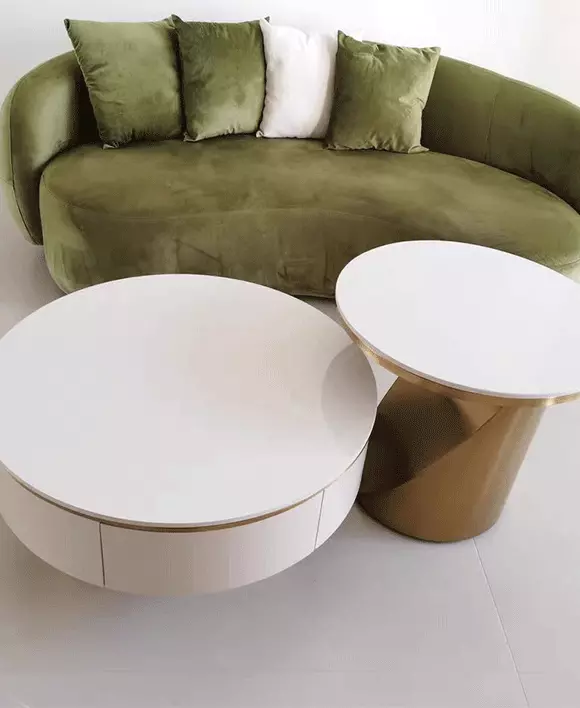Enhance your living space with this modern beige sintered stone and metal base round coffee table set of 2. This versatile set, featuring a sintered stone table top and a sturdy metal base (available in gold or grey), offers both style and functionality. The larger table includes two spacious drawers, providing hidden storage to keep your space tidy. Its small table companion complements the set perfectly, making it ideal for use as a lounge table or occasional table in any contemporary setting. With sizes of 90x90x35cm and 60x60x51cm, this designer coffee table set adds a touch of elegance and sophistication to your home.