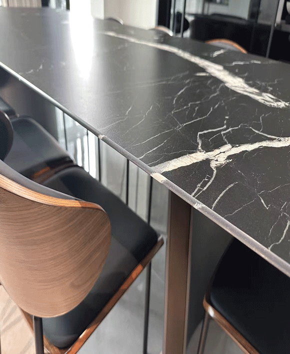 Upgrade your dining experience with our Modern Italian Style Sintered Stone Dining Table. This stunning table, available in 6/8/10 seats, features a sintered stone tabletop in the elegant combination of black and gold through its lustrous finishes. Sintered Stone undergoes a special heat-pressure treatment to strengthen it for duralility.The contemporary design adds a touch of sophistication to any dining room. With a choice of seating capacity and color options, such as Lauren White Gold and Armani Grey, you can create the perfect dining set that suits your style. Explore the fusion of affordability, high quality, and exceptional design with our Italian Style Dining Table today.