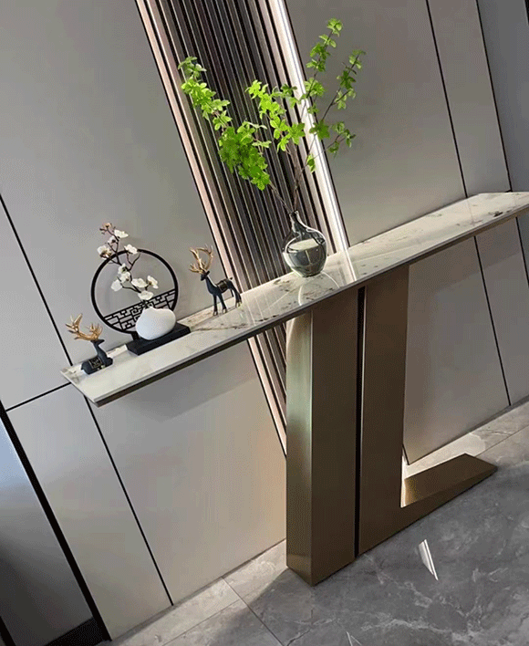 This console table is a great choice of luxe update for your lounge or home entrance. The golden base takes its inspiration from modern design, and the sintered stone and marble top is a stain-resistant finishing touch. Your choice of accessories on top of the console table can add personality that defines your home.