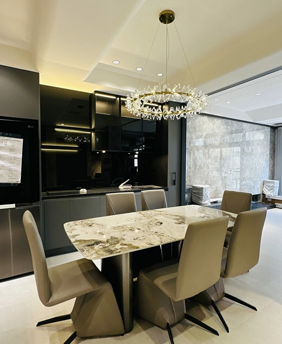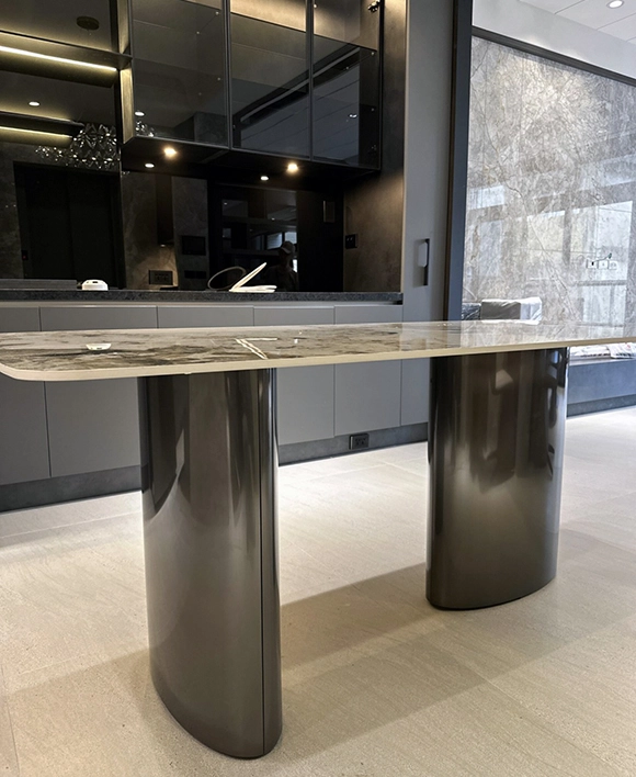 Upgrade your dining area with this Modern Metal Dual Pedestal with Sintered Stone Top Dining Table, a perfect blend of strength and elegance. Designed to seat 4 to 8, this versatile dining table for 8 seater offers a clean and architectural silhouette, ideal for both formal and casual settings. The sleek dining marble table top mimics the luxurious look of stone while offering superior durability and low maintenance. Customisable in both colour and size, it’s ideal for those seeking dining room tables marble options with a bold modern touch. Whether you’re styling a dining table and chair layout or planning a new dining room setting table, this dual pedestal design provides stability without compromising on style. Its rectangular profile is great for a dining room table to seat 8, making it a smart choice for growing households or frequent entertainers. A must-have for those searching dining tables sets that make a statement