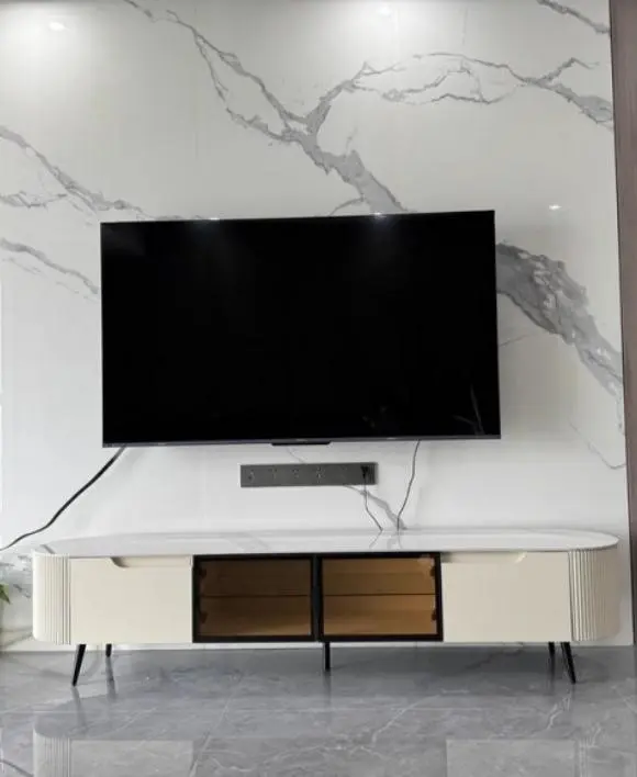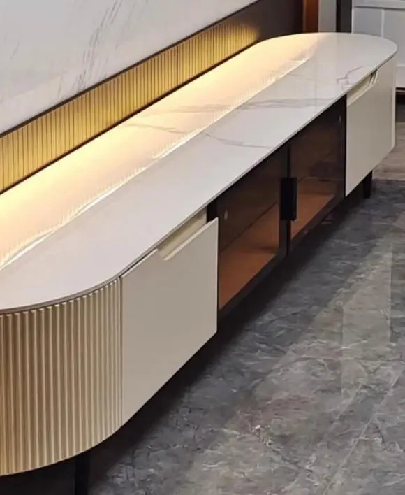 Modern Oval-Edge Sintered Stone & Timber TV Stand/TV Unit with Glass Door Storage