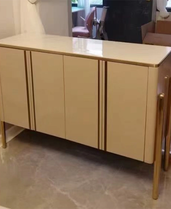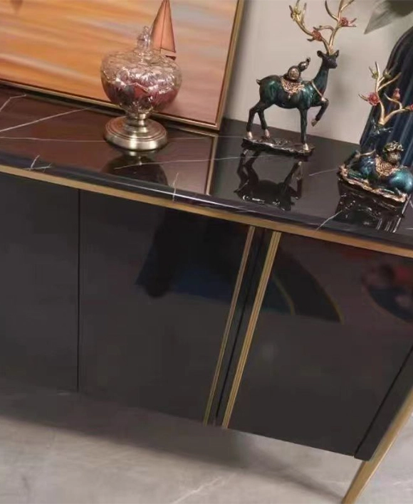Luxury Paris Sintered Stone Sideboard Buffet with Gold Frame and Legs. This high gloss sideboard offers a sophisticated design with a sintered stone countertop and stainless steel frame and legs for a luxurious touch. The E1 grade environmentally friendly lacquer board ensures durability and sustainability. Available in two sizes: 120x40x90cm and 150x40x90cm. Fully customizable countertop colors make it ideal for various interiors. The buffet furniture features spacious storage for dining essentials, perfect as a sideboard cupboard or dining room storage cabinet. A striking addition to modern living spaces, this piece embodies elegance and functionality.