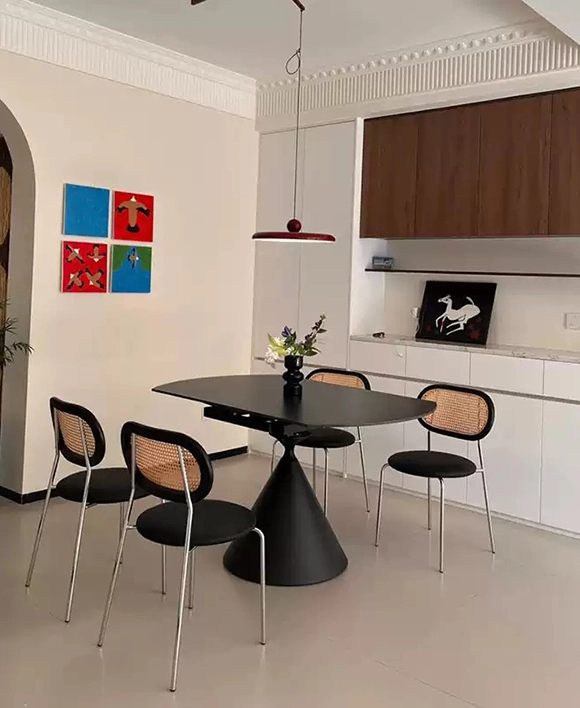 Featuring an innovative extension mechanism, this extendable dining room table smoothly transforms to accommodate more guests, making it one of the most versatile dining extension tables available. Offered with either a white or black designer base, it pairs beautifully with stone finishes like pure black, pure white, Snow Rock, and more.