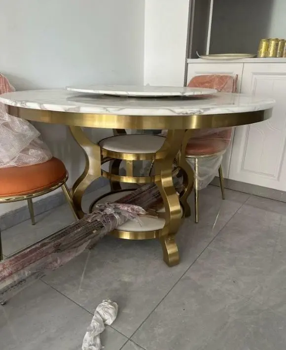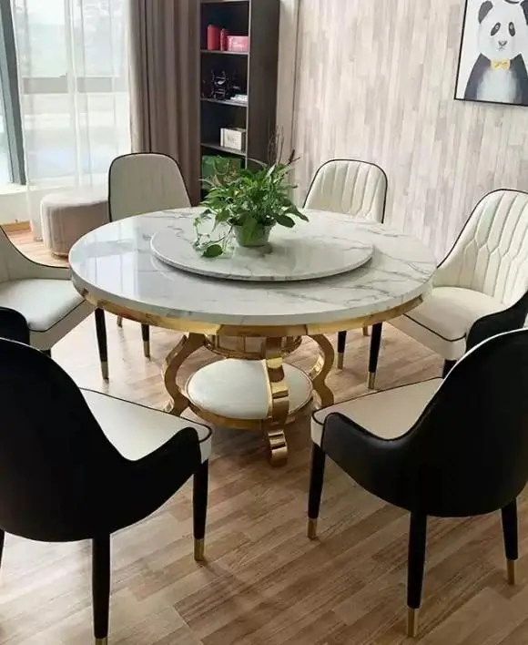Add timeless elegance to your dining room with this round dining table featuring a sintered stone top and a luxurious gold ribbon base. Designed with a built-in Lazy Susan and seating for 4–8, it’s perfect for both daily meals and gatherings. This dining table set is fully customisable in size and colour to suit your dining room with round table aesthetics. Ideal for breakfast room tables or modern dining room setting table spaces, it balances durability and style for upscale homes.