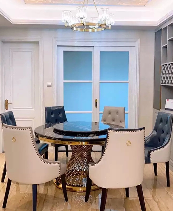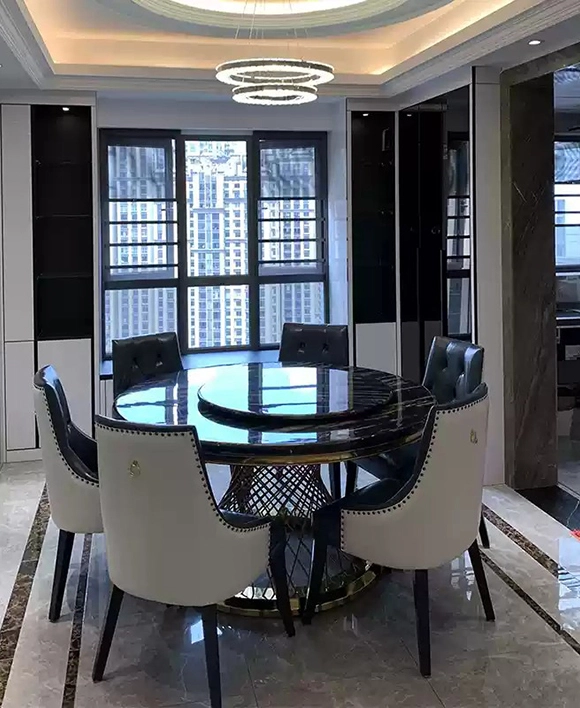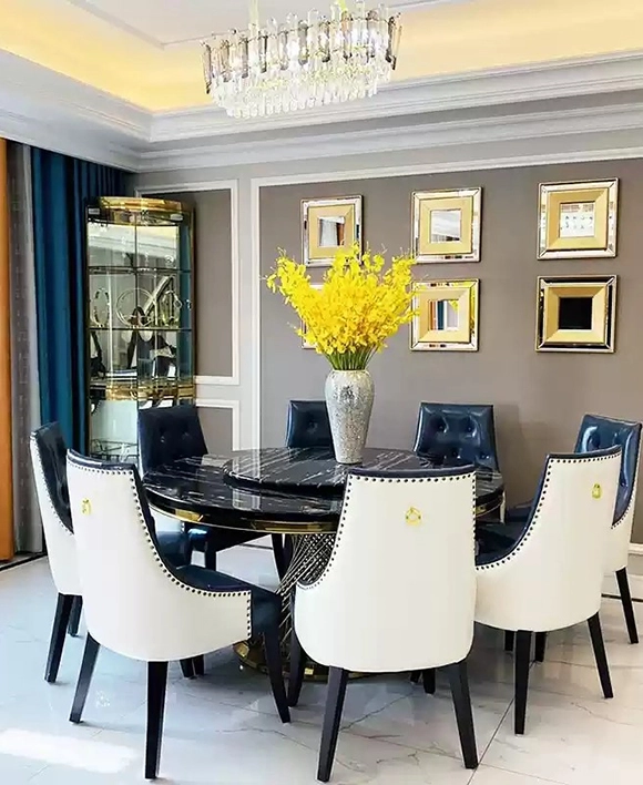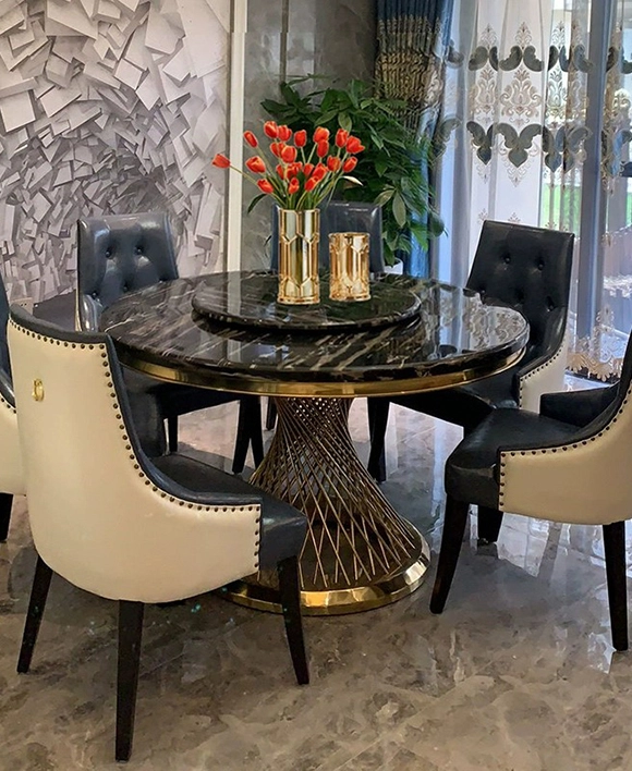 Affordable round dining table with Lazy Susan, seating 4 to 8 people and perfect for both breakfast room tables and dining room with round table setups. This elegant round dinette table is fully customisable in colour and size, making it a standout piece among premium dining tables. Designed for stylish homes that value form and function, it brings sophistication to everyday dining and special gatherings alike.