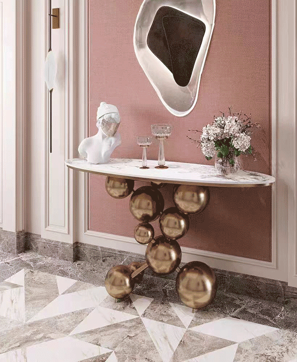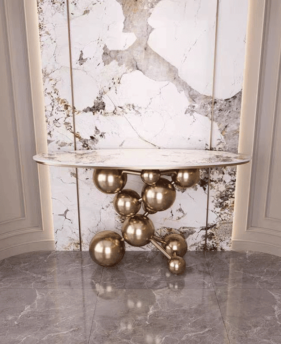 This console table is a great choice of luxe update for your lounge or home entrance. The golden base takes its inspiration from modern design, and the sintered stone and marble top is a stain-resistant finishing touch. Your choice of accessories on top of the console table can add personality that defines your home.