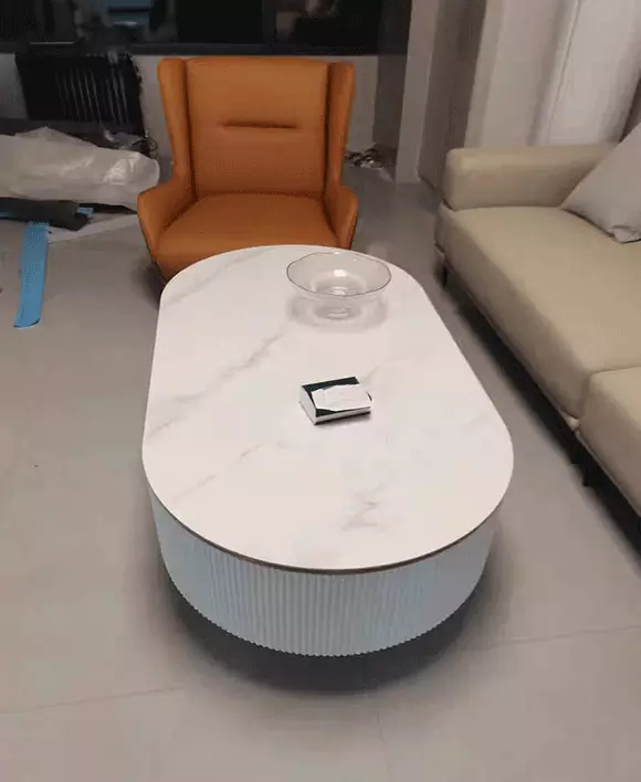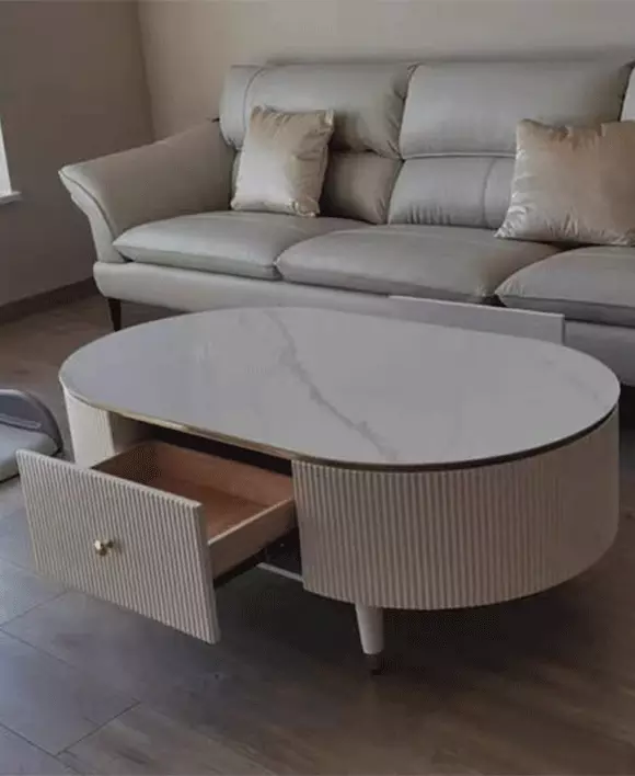 This elegant oval coffee table features a luxurious sintered stone top with sleek metal legs in a refined electroplating finish. The striped design adds a modern touch to any living space, making it a perfect centerpiece. Crafted from E1 grade environmentally friendly lacquer board, this designer coffee table is built for durability and style. The 130x70x43cm size, along with the sintered stone top, is fully customizable to suit your interior design needs. Whether you’re enjoying your morning cup at the table for coffee or using it as a stylish table with storage, this piece combines functionality and design seamlessly.